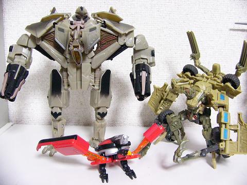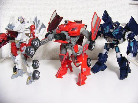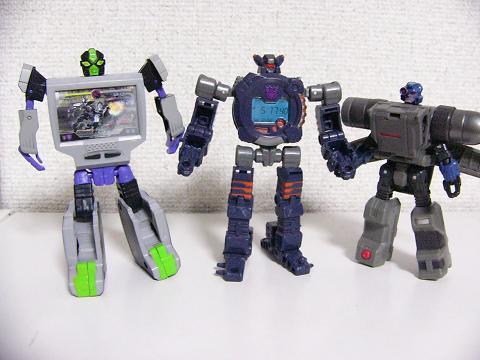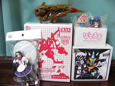 | ガンプラ王がやっと終わりいろいろ落ち着いたのでやっと更新できます。 トランスフォーマー字幕、吹き替えどちらも見てきました。 いやー、いいですね映画。 TFらしさを残しつつ映画独自の世界を構成しているのがいいです。 というわけで映画TF2弾からアップしてなかったTFたちを一気にアップ。 今日はデストロン(ディセプティコン)編。 復刻版破壊大帝メガトロンです。 メガトロン様何気に初購入です。 本体はダイキャストでずっしりと重く、全てのパーツを付けると かなり大きく感動しました。 MUSIC LABEL SOUNDWAVEです。 もちろん買ったのはブルーのほうで。 感じとしてはロボマスとかに近い感じ。 肘は向きを変えれば二重関節です。 武器はしまえませんが完全変形です。 なんか微妙とか言われてますが自分は気に入りました。 なによりこのサイズでプロポーションのいいサウンドウェーブがないので。 クラシックでリメイクでもしていれば話が違ったでしょうが。 タイタニウムはひどいできだし。 ちなみにmp3プレイヤーとしては使ったことがないですw リアルギアディセプティコン組み。 パワーアップVT6はすごいショボーン。 顔もダサいし変形もオートモーフだけって感じ。 一番のハズレな気がします。 ミーンタイムは個人的には大当たり。 ロボモードがかなり動きます。 時計としても割りとかっこいいし。 ズームアウトX25は背中の羽がチャーミング。 ビーファイターを思い出しますw 無念お砲塔ブラザーズ。 レッケージはかなりスタイリッシュ。 脚とかかっこいいです。 うちでは武の刀を持たせてます。 お砲塔長男のスウィンドルはお砲塔のオートモーフが楽しいです。 ペイロードはパーツがポロポロ取れます。 なんで接着してないんだろう。 胸のクローは楽しいですがどう見てもビーダマンです。 映画出る組+α。 スタースクリームはビークルモードが分厚いですw ロボモードは不評ですが自分はいいと思うんですがねぇ。 奇形な感じがナイス。 逆間接にするとさらによし。 ボーンクラッシャーはさらに奇形。 小さい車体が広がってかなり大きくなります。 この詰め込みっぷりがさすがTF。 タカラはすごいです。 ブースターX10はすごいいい感じ。 まさにサウンドウェーブの相棒としか言えません。 脚の保持が弱い意外悪いとこがないですね。 というわけでデストロン組みでした。 次回はサイバトロン(オートボット)とマイクロンをアップしようと思います。 ・・・・・・・・・・・・・・・・・・・・・・・・・・・・・・・・・・・・・・・・・・・・・・・・・・・・・・・・・・・・・・・・・・・・・ 2007/8/20 実家から帰還しました。 実家だとクーラー使い放題なのが素敵。 今日の収獲品。 キャラホビいってまいりました。 朝8時から並びました。 曇り空の中最高気温29度という快適なまるで夏とは思えない中2時間、 会場後ディーラーへ。 超将軍ビクトリーが欲しかったですがタッチで買えず。 その後ぷらすさんに今年も挨拶。 ガンキラーがまだあったので購入。 後でサイトのほうを見るとかなり大変だったようで・・・。 お疲れ様です。 他の中古玩具ディーラーでプロトフォームのスタスクが1kだったので購入。 かなりラッキーだったかも。半額だし。 他に鶴屋さんのメイド服のが定価切っていたので購入。 これで鶴屋さん3体目。MAXの欲しい気もするがでかいしなぁ。 企業ブースはCM'sでまさかのぽてまよ発見。 今期一押しアニメなので即購入。 ぽてまよかわいすぎ。 ついでにサイバトロン破壊司令官ことダイアトラスも購入。 こいつ5kじゃなかったっけ・・・? 個人的によかったのはバンダイのSD三国伝とかタカラのカマロ展示とか。 1/1スコタコも見れたし。 それにしても一般ディーラーの空席っぷりがひどかった。 半分は空席だったかも。 ステージイベントもしょっぱっかったし。 もっと元気なイベントだった気がするんだがなぁ・・・。 ガンプラ王、オラザクが終わったらゆっくりガンキラーを組もう。 色は大河カラーの白かな、キラーマスターをゆっくりと待ちながらw ・・・・・・・・・・・・・・・・・・・・・・・・・・・・・・・・・・・・・・・・・・・・・・・・・・・・・・・・・・・・・・・・・・・・・ 2007/8/13 ワンフェスに行かないワンフェスの楽しみ方。 というわけで後輩にいろいろ買ってきてもらいました。 今日の収獲品。 GENEBLOCK・F3ユニット・F3ソルジャーです。 先行販売品。 とりあえずでかすぎ。 MGぐらいかと思ったらもっとでかいし。 比較用にこの前買ったしばいサザビーを。 しかしこれブラインドで中のランナーのカラーがわかりません。 適当に買ってきてもらったんですがレシピはワニでした。 んでパッケージとにらめっこしてなんとかソルジャーをくみ上げた、と。 よく動くんですが品質は悪いです。 ところどころかちっとははまりません。 できがいいだけに残念。 最近は品質が上がってきていただけに悲しいです。 これでFソ