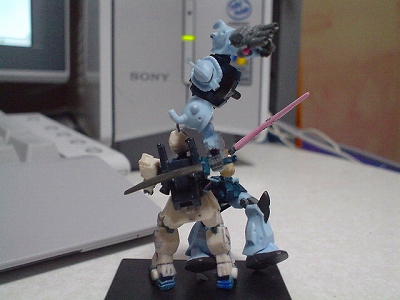 OVA08小隊 10話「震える山」より Ez−8が弟に青く塗られてしまい かなり青っぽくなってます(汗 グフカスタムがズバァンと 斬られたシーンです。 |