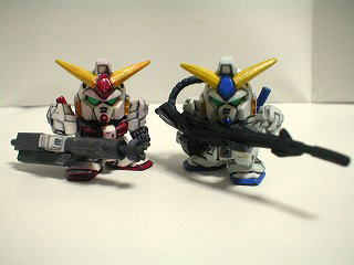 揃い踏み。 実はこいつらには秘密が・・・。 なんと4号機は5号機から 5号機は4号機から作ってあります! 理由は2体ともパーツをガンコレに 取られたためです。哀れ・・・。 |