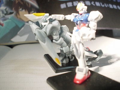 ストライクVSジンです。 最初のジンとの初戦闘を 再現されてます。 ジン危うしです(笑)。 |