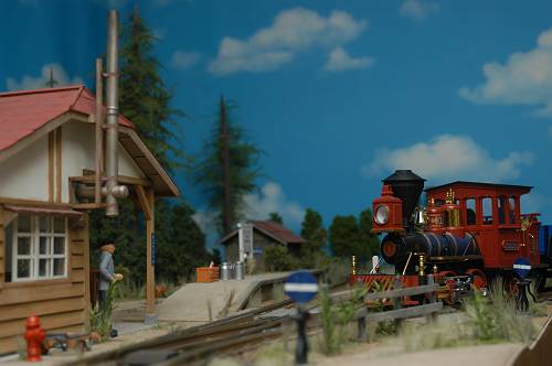 プライザー製の人形はどう見ても外国人で、駅名票に漢字がなければ、どこの国のレイアウトか分かりませんね。機関車はアメリカンタイプだし。 |