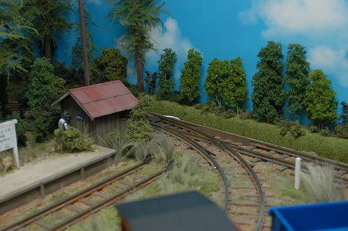 レイアウトと背景画との隙間には、50mm厚の発泡スチロール板に芝生紙を巻いて樹木を差し込んだものを押し込んであります。 |