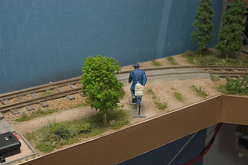 色々まだ細部に手を入れる余地が残っているのですが(人形はもちろんのこと)、一応第一期工事は完了というところでしょうか。ここに写っていないヤード部分は、とりあえず『隠しヤード(笑)』ということでご勘弁(^^; 実を言うと、何とかターンテーブルを仕込みたいと考えているところで、そのためヤードの完成は当分先のことになりそうです。線路でスペースが埋まっているので、シーナリィ工作はバラスト撒き位で終わっちゃいそうなんですけど(^^; |