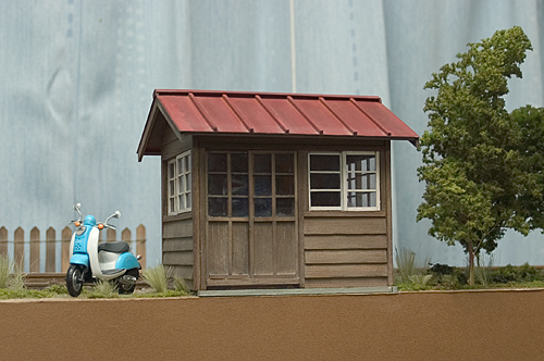 屋根の下地を作って仮組み。出入り口が線路に面しているので、鑑賞方向からは裏の壁が主に見え、あまり面白くありませんね(^^; 製作に必要な3mmの角材を切らしてしまったため、今日の作業はここまでです。 |
