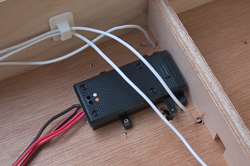 ポイントマシンは全て、台枠裏に設置しました。以前掲載した写真が不鮮明だったので、これを機にもう一度お見せします。といっても複雑なことをしているわけではありません。マシンの作動腕に太目のピアノ線を打ち込んで、表側のポイントのスローロッドに差し込んだだけです。これが実用になるLGBのポイントマシンは本当にありがたいですね。 |
