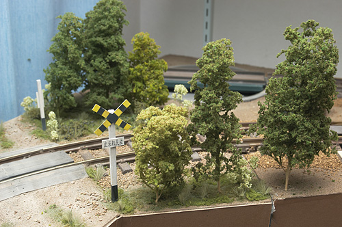 ケーディーのアンカプラーは踏み切りに見立てるというお馴染みの手でカモフラージュします。ストラクチャーを建てられないこのセクションでは、このようなものも、風景の単調さを救う重要な小道具となりますね。 |