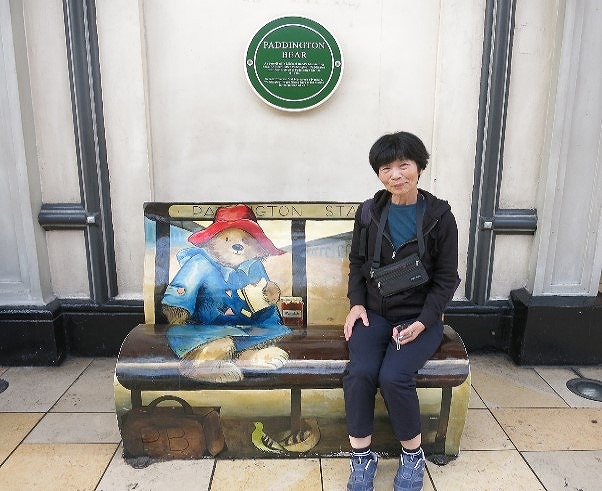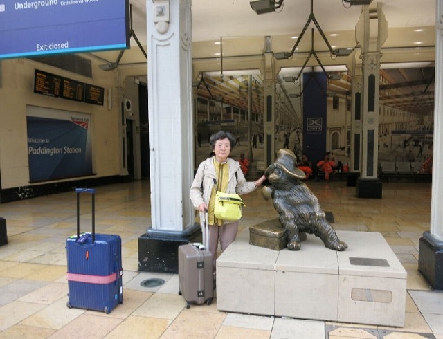 そこでこの疑問を解決すべく、Paddington駅1番線ホームを皆で探検することにした。10時にホテルを出発、スーツケースを転がして徒歩でPaddington駅に到着。1番線ホームを進むと、まず熊のパディントンのベンチがあった。これは初めて見るものでパディントンが座っている絵が描いてあり、座るとパディントンと並んで座ったように見えて楽しい。少し先に以前からあるパディントンのブロンズ像があるが、写真のようにそのあたりはホームから大きく引っ込んで空間があり、頭上の左上の案内板に出口閉鎖(Exit