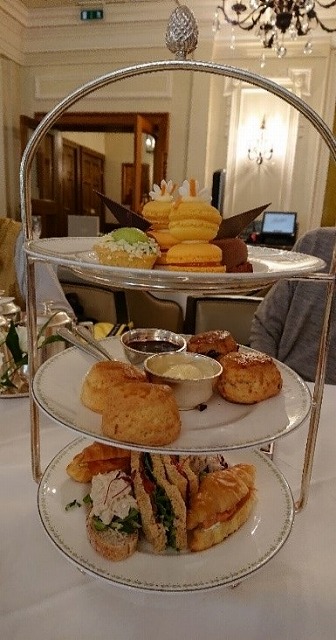恒例のアフタヌーン・ティーは、有名なBetty's Caféで食べた。土曜日の夕方なので、混んで入れないと困るため事前に日本から予約を入れておいた。一人£34.95。しゃれたガラスの器にマリネした小エビと玉ねぎ、キュウリなどのappetizer。小ぶりのクロワッサンにクリームチーズとスモーク・サーモン、ドライトマトのパテ、シーザース・ドレッシングのチキンなどのサンドイッチ。二種類のスコーンは、香ばしく焼かれていておいしかった。小さなお菓子は、非常にしっかりとした味のマカロンとカスタード・タルト、塩キャラメル、リッチなダーク・チョコレート。クロテッド・クリームは数藤さんの評価によると、やはりデボンシャー・クリームの方が勝っているそうだ。おかわりのプレートも出してくれたので結構お腹がいっぱいになった。