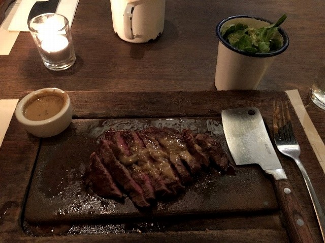 コヴェント・ガーデンにある小西さんおすすめのステーキ・ハウスでイギリス最後の夕食をとる。包丁のような幅広のナイフが印象的。ステーキは赤身でさっぱりして美味、リーズナブルな価格で、デザートのアイスクリームもおいしかった。