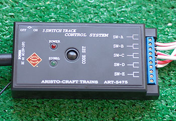 パワーパックのラジコン化といっても、本当にパワーパックだけではポイントの操作時にコントロールボードやポイントの近くまで行かなければなりませんので、このシステムにはポイント用のレシーバーも用意されています。左の写真がそれで、1台のポイントレシーバーで5箇所ののポイントを操作することが出来ます。これは10台まで増設可能で、最大50箇所のポイント操作が可能です。出力ターミナル部分はLGBのポイントマシンの規格に合わせてあります。 |