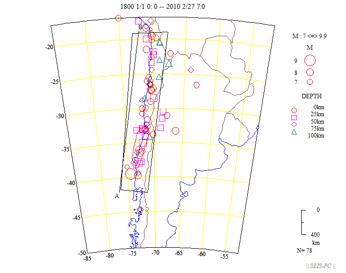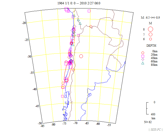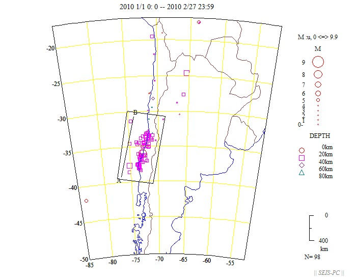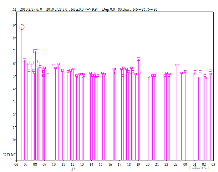 図1:米国地質調査所による2010年2月27日05時から28日03時までの22時間の震源分布(時刻は世界標準時:日本時間−9時間)。ハーバードのMwは8.8。余震分布は、長さおよそ600kmになっています。