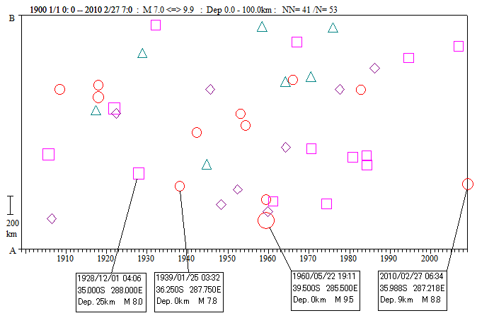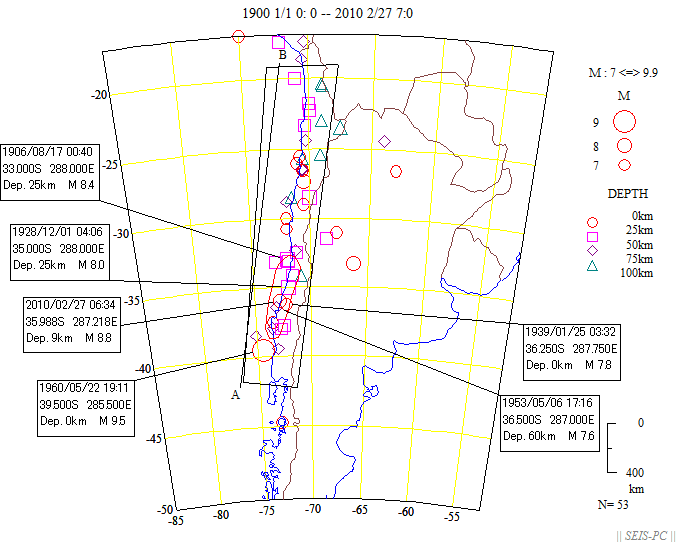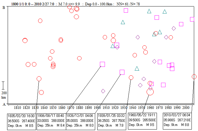 図4:宇津カタログ+米国地質調査所PDEカタログによる1900年以降のM7以上の震源分布。今回の余震域は1928年M8.0の地震と重なっているようです。1960年M9.5チリ地震は、今回の余震域の南端部で破壊が始まり、南へ伝わっています。