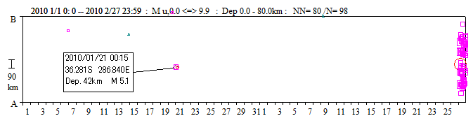 図9:図6の枠内を切り出した時空間分布。横軸のすぐ下にある数値は日付。今回の震源付近で1月21日に小規模な活動があったようです。