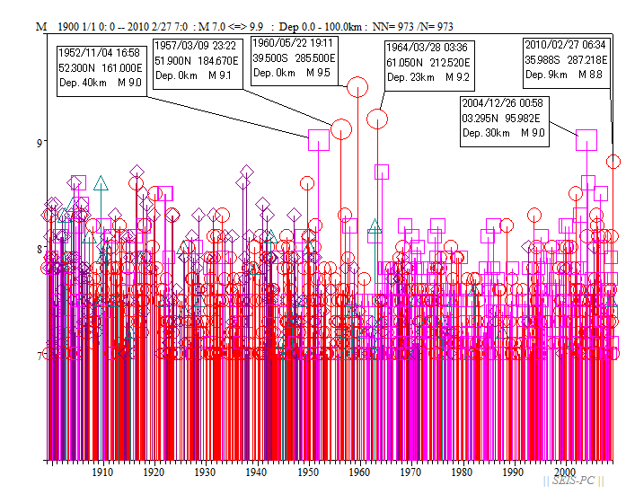 図10:宇津カタログ+米国地質調査所PDEカタログによる全世界の1900年以降のM7以上のマグニチュードの時間分布。1952年から13年間に超巨大地震が4回すべて起きている。このときはすべて太平洋の周囲でした。