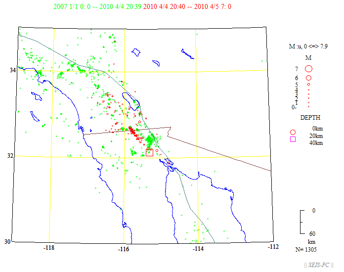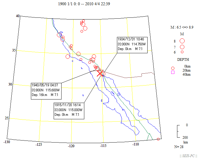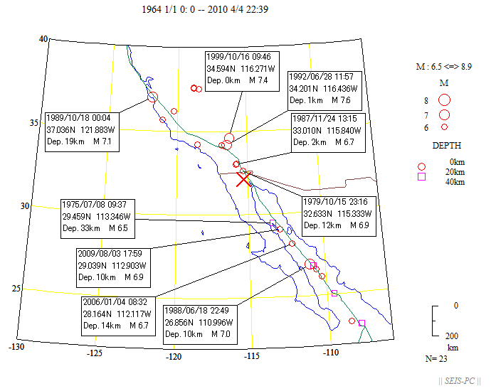 図1:米国地質調査所による2010年4月4日22時39分(本震が起きる前)まで浅い震源分布(時刻は世界標準時:日本時間−9時間)。今回の地震のMwは7.2で×印で示しています。カリフォルニア湾内は活動が活発。緑色線は、プレート境界。