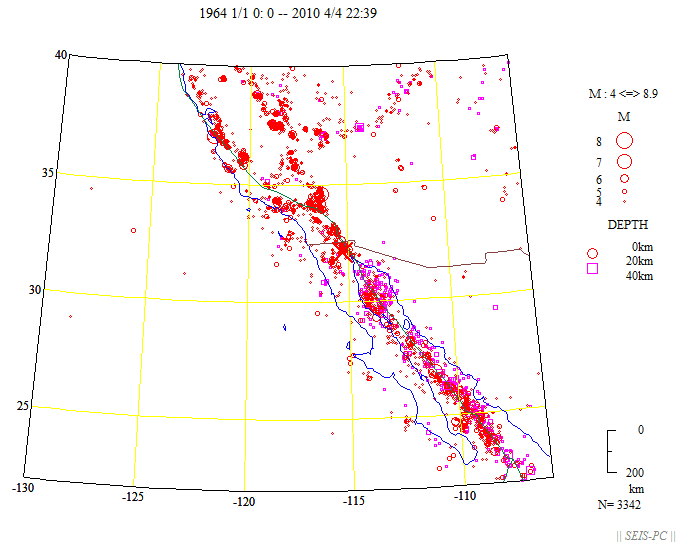 図3:米国地質調査所の震源データによる1964年から本震発生前までM6.5以上の深さ40kmまでの震源分布。