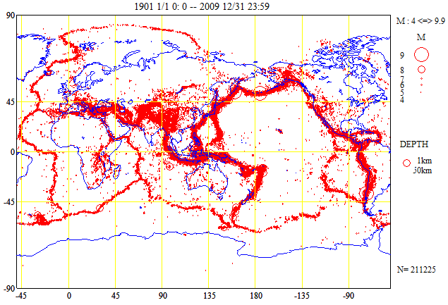 図8:20世紀以降の50km以浅でM4以上の震源分布。プレート境界が明瞭に分かる。1963年までは、エングダルらのカタログ、1964年以降は米国地質調査所PDEカタログによる。但し、2009年は、週報や速報によるので小さい地震は掲載されていないので表示されていない。