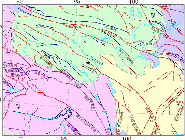 図6:中国地震局のHPに示されていた活断層分布と今回の震源(黒色★)。矢印は北側、南側の動きです、加筆しました。