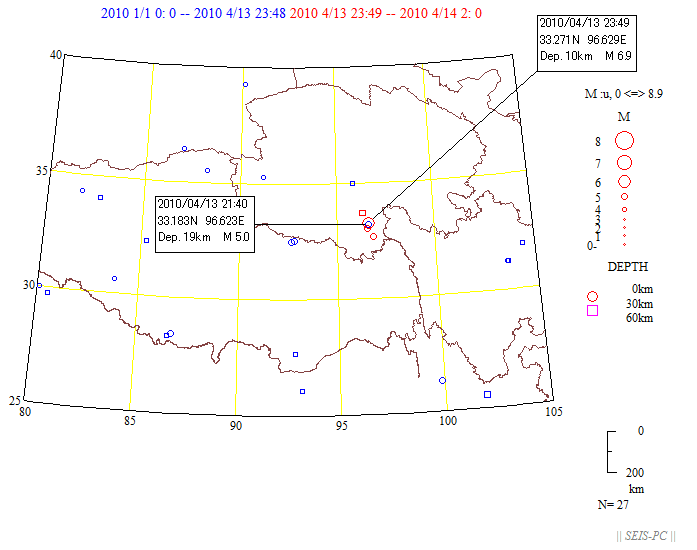 図1:米国地質調査所のPDEカタログによる1970年以降の震源分布。今回の地震M6.9。ハーバードMw6.9で横ずれ型地震。中国地震局によるとMs7.1で、震源は青海省玉樹チベット族自治州玉樹(Yushu)県。四川省鮮水河断層の北西延長部にあたる。茶色線は省の境界線。