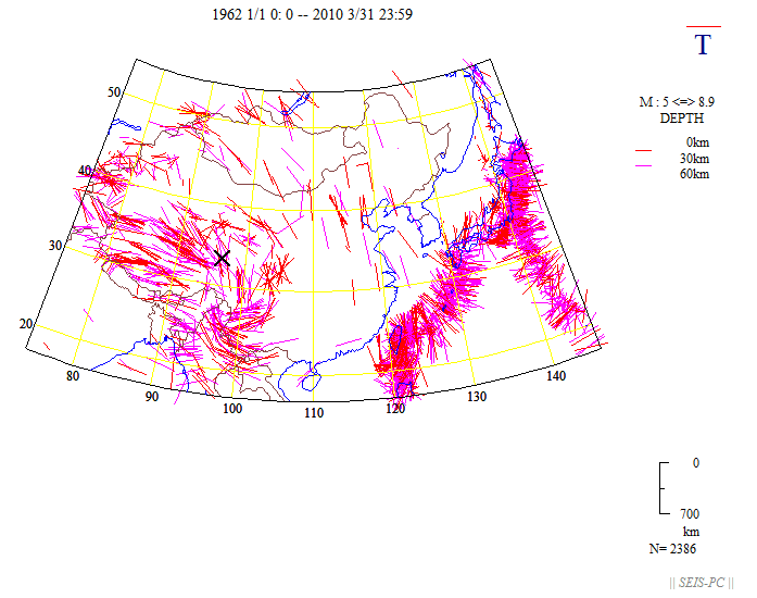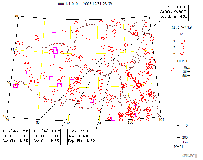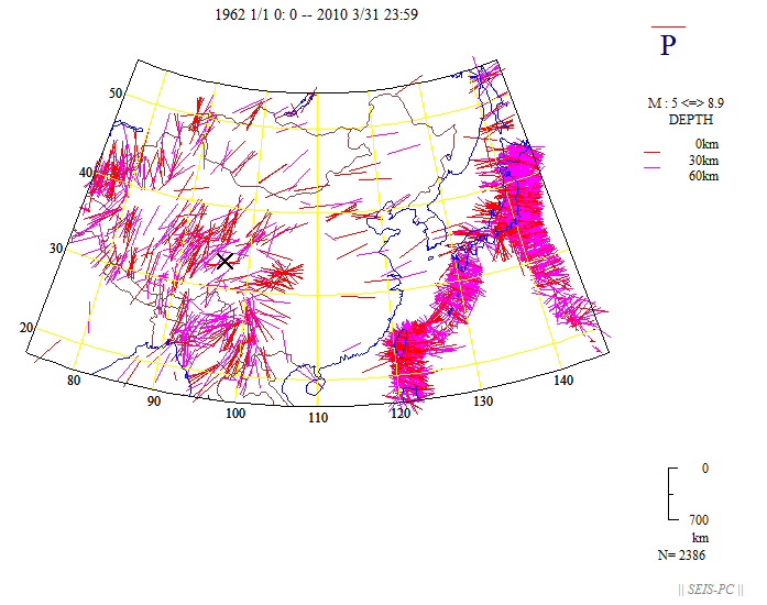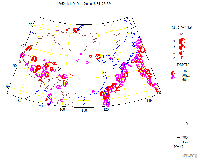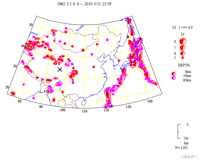 図2:M6以上の震源分布。青海省南部では、久しぶりの大地震。最近7年間は北部で活発だった。