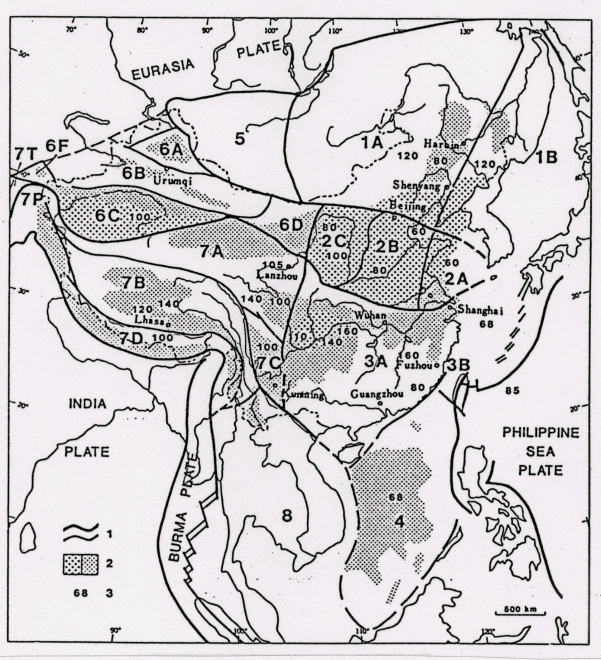 図8:Ma(1988)が提案したマイクロプレート構造。「7A」とかは、それぞれブロックとされ、マイクロプレートに相当しています。この図では龍門山断層の向きがおかしい。