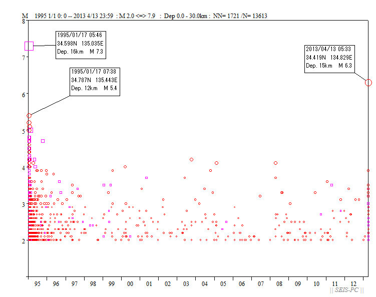 淡路島の地震Mjma6.3、Mw5.8(2013/4/13) ![]() 図1:データは気象庁一元化震源で、2012年11月以降が暫定震源。時刻はすべて日本標準時。 1995年から4月13日24時までのM未決定も含めた浅い地震の震央分布。 ![]() 図2:図1の枠内の震源のマグニチュード・時間の図。 これまでの最大余震は、本震の約2時間後に余震域の北部で起きたM5.4だった。 ![]() 図3:図1の枠内の震源の時間空間分布図。 今回の地震の発生前にこの震源域はやや静穏だったようである。 ![]() 図4:図1の枠内の震源の回数−時間の図。赤色は毎月の回数で、青色は累積回数。 今回の地震発生前に地震発生数がやや減ったように見える。 (期間の終わりが、4月31!日なっているのは4月13日の間違いです) ![]() 図5:気象庁一元化震源で、M2以上の震源分布。 ![]() 図6:図5の枠内の震源のマグニチュード・時間の図。 ![]() 図7:図5の枠内の震源の時間空間分布図。 ![]() 図8:気象庁一元化震源でM1.5以上の震源分布図。 青色は、13日05時までで、赤色は05時01分以降。 下方に地図の枠の震源を直線ABに投影した断面図も付記しました。 今回の地震は、西に傾きさがる逆断層です。 ![]() 図9:グローバルCMTグループによるCMT解の空間分布図。時刻は世界標準時。 ![]() 図10:気象庁P波初動解によるP軸の地表面投影分布図。M2以上。 今回の地震は含まれていません。 ![]() 図11:図10の枠内のメカニズム解のP軸を直線ABへ投影した時間変化図。 ![]() 図12:図10の枠内のメカニズム解のT軸を直線ABへ投影した時間変化図。 ![]() 図13:1975年中国遼寧省海城地震発生後のM5以上の震源分布図。 データは、米国地質調査所。時刻は、世界標準時。 本震後、長期間たった後やや規模の大きな余震が起きた事例。 ![]() 図14:図13の枠内の震源の時間空間分布図。約24年後にM5.3の余震が起きている。 ![]() 図15:1976年中国河北省唐山地震発生後のM5以上の震源分布図。 ![]() 図16:図15の枠内の震源の時間空間分布図。ここでも約19年後にM5.0の余震が起きている。 戻る |