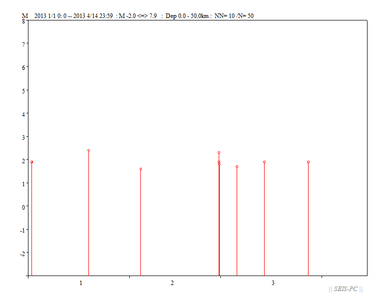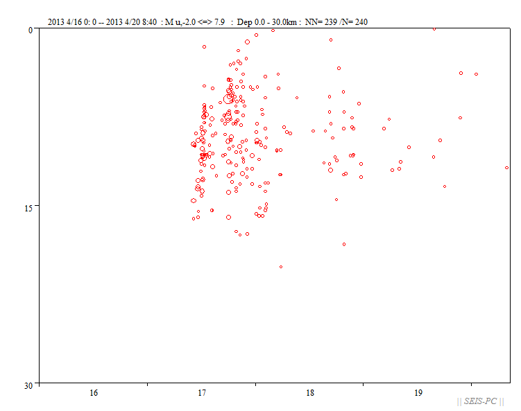 三宅島付近の地震活動(2013/4/17) ![]() 図1:データはHi-net自動震源で、時刻はすべて日本標準時。 主な活動は、大野原島火山の近くのようです。 海上保安庁が変色水を確認したと報告した位置は三宅島の東で×印で示しました。 ![]() 図2:図1の枠内のM−時間図。 ![]() 図3:図1の枠内の時間−空間図。 ![]() 図4:図1の枠内の震源の深さ−時間変化図。 最初は、深い方から浅い方へ広がったように見える。 ![]() 図5:気象庁一元化震源による今年に入ってからの震源分布。データは、4月14日まで。 ![]() 図6:図5の枠内の震源のM−時間図。 戻る |