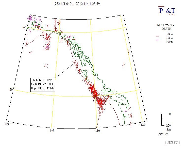アラスカ・クレイク沖の地震M7.5(2013/1/5) ![]() 図1:データは米国地質調査所で、時刻はすべて世界標準時。 1970年から今回の地震(8時56分:日本時間は17時56分)までの浅い地震の震央分布。 今回の地震の震央は×印で示しました。 北米プレートと太平洋プレートの境界の地震と思われます。 去年10月の地震の北西約300kmのところで起きています。 ![]() 図2:今回の地震の震源を加えて示した。 丸印と×印が少しずれているが同じ地震。 ![]() 図3:図2の枠内の震源の時間・空間分布図。 横軸の数値は年、縦軸は上側が北西側。 ![]() 図4:データは米国地質調査所でよるM3以上の震源分布。 ![]() 図5:グロバルCMTグループによるメカニズム解の分布。実線がP軸、破線がT軸。 今回の地震と同じところで1979年にM5.5の地震が起きていて、 右横ズレであったので、今回も同じタイプと思われる。 戻る |