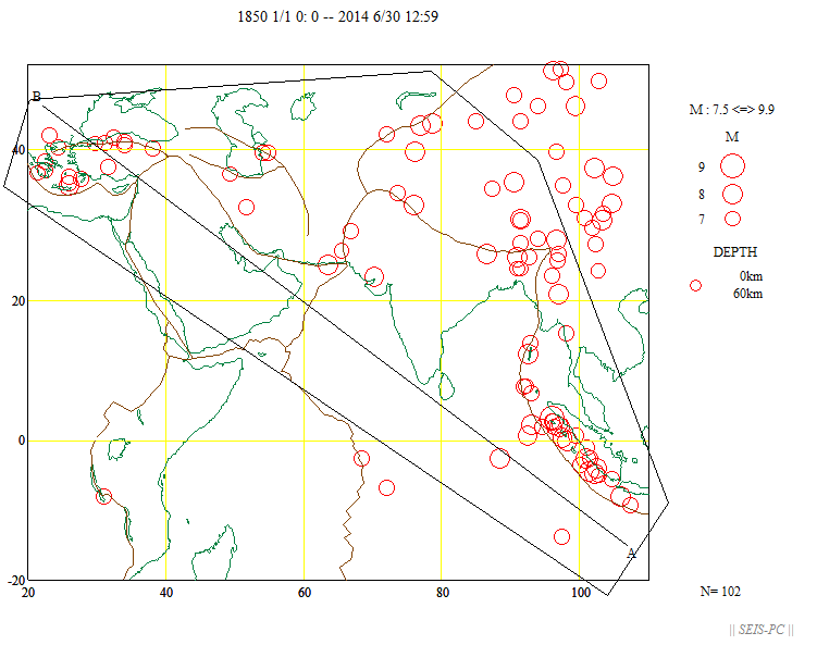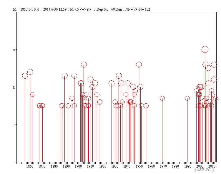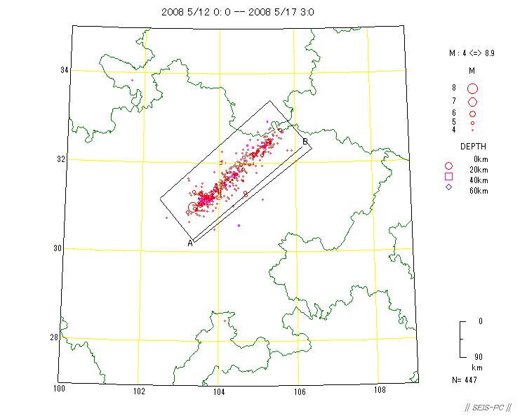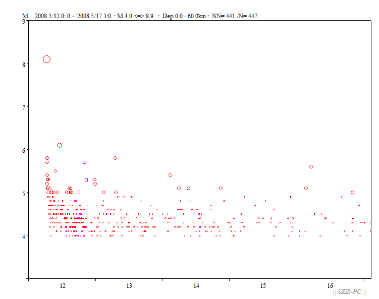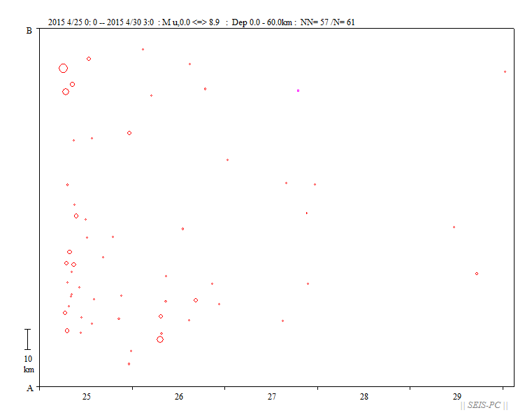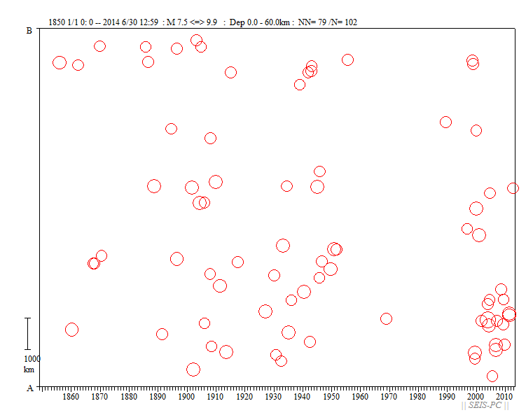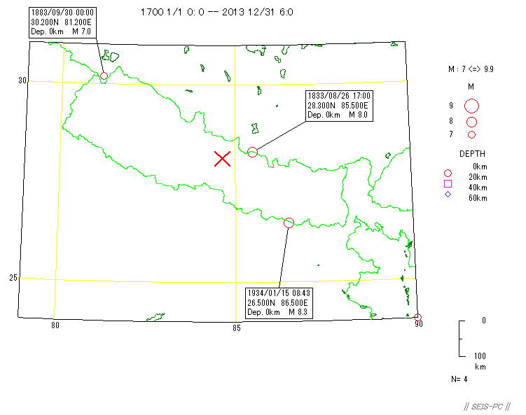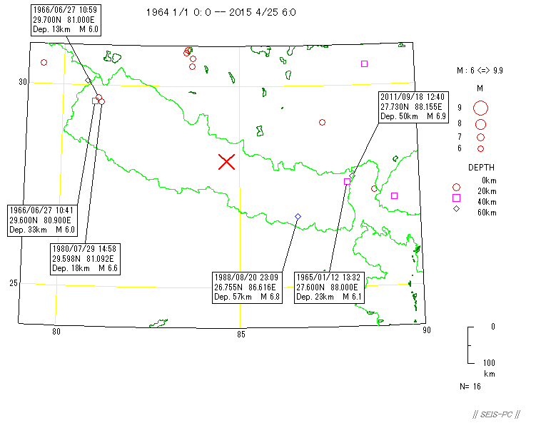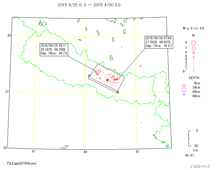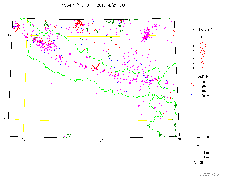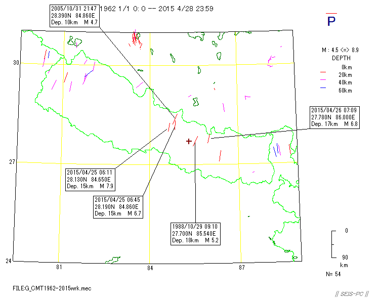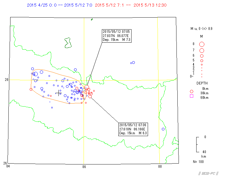 | ネパールの地震M7.8(2015/4/25)とM7.3(5/12)  図A:青色マークは、M7.3の地震が起きる前までの震源です。 赤色マークはM7.3を含み、それ以降の約29.5時間の震源です。 橙色の線は、M7.8の地震の余震域を囲ったものです。 今回の地震はM7.8の地震の震源域に隣接した東外側で起きています。 狭い意味での余震ではないようです。+印はカトマンズの位置。  図0a:30日03時まで本震・余震分布(米国地質調査所のデータ)ですが、本震が西の端の一番大きな○です。 M7.8となっていますが、モーメントマグニチュードMwは7.9でした。余震域が長さ100km以上もあります。 この地震は、東に向かって破壊が広がったようで、 首都のカトマンズ(+印)も震源断層上だったようで、大きな被害が出ています。 カトマンズの位置は、Wikipediaの情報を使いました。 今のところ最大の余震は余震域の東の端で起きたM6.7です。  図0b:上の図の時空間分布図です。上が西側です。 本震の直後から100km以上東の所まで余震が広がっており、この間の領域の下に震源断層があると思われます。 今のところ本震の58分後に起きたM6.7の余震が最大です。この地域は、余震活動が低調なようです。  図0c:図0aの枠内のマグニチュード*時間図です。縦軸がマグニチュードを示します。  図0d:2008年四川地震Mw7.9の本震・余震の震央分布です。データは米国地質調査所で、期間は図0aと同じです。  図0e:図0dの枠内のマグニチュード*時間図です。縦軸がマグニチュードを示します。 今回のネパール地震に比べ余震活動は活発です。  図1:ネパールでM7.9(米国地質調査所)の地震が、4月25日06時11分26秒(世界標準時)に発生しました(日本時間だと15時)。 ×印で表示したのが今回起きた地震の震源位置です。 今回の地震の少し東で1833年にM8の地震が起きていて、このときはネパールで死者414人(宇津カタログ)とされています。 1800年以降にM7以上の地震が4個(今回も含め)起きています。 震源の深さ40km。震源データは、米国地質調査所によります。  図2:1964年から今日までに起きたM6以上の震源分布です、深さ60km以浅。 震源データは、米国地質調査所によります。  図3:1964年から今回の地震まで直前までのM4以上の深さ60km以浅の震源分布。 今回の地震は、インドプレートがユーラシアプレートの下に沈み込むプレート境界で起きた逆断層でした。 ネパール中央域では20世紀以降は余り地震活動が高くありませんでしたが、 このプレート境界と周辺域では1997年以降活発化していました。  図4:1962年から今年4月28日までのM4.5以上の深さ60km以浅の地震の圧縮軸方位(地表面に投影)分布。 圧縮軸の方向が、インドプレートが北上しているようすを示しています。 本震がMw7.9で余震がすぐ東側にMw6.7とカトマンズ(+印)より東のMw6.8の2個メカニズムが決まっています。  図5:以下は以前作った図です。 1850年から2014年6月までのM7.5以上の深さ60km以浅の震源分布。宇津カタログ+米国地質調査所の資料。 枠で囲った範囲を以下の図で示します。  図6:図5の枠内の地震のマグニチュードと時間の図。  図7:図5の枠内の地震の時空間の図。上が北西側でギリシャ・トルコ、下がスマトラ側です。 1997年11月08日Mw7.5のチベットの地震以降、このプレート境界周辺域は活発化していました。 戻る |