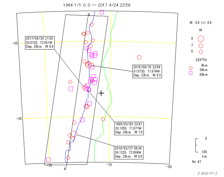 チリ・バルパライソ沖(2017/04/25)M6.9 ![]() 図1:米国地質調査所(USGS)の1964年以降の震源データです。深さ60km以浅、M6.5以上(世界標準時)。 今回の地震の震央には左上にパラメータを示しています。 右側にパラメータを示したのは、過去の主な地震です。 ![]() 図2:図1の枠の中の震源の1964年以降の時空間図。 今回の地震は、右端縦線の上です。 パラメータを示した地震は同じような位置に見えますが、少しおきに離れた場所で起きた地震です。 今回の地震の近くで起きた地震は1985年M7.8の地震です。 戻る |