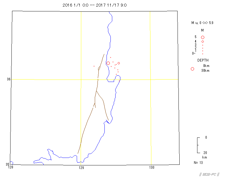 韓国南東部の浦項(ポハン)の地震(2017/11/15)M5.4 ![]() 図1:韓国気象庁(KMA)の2016年から2017年11月15日15時15分までの震源データです。 Mすべて(日本標準時)、韓国気象庁は、深さを発表していないので、深さ10kmは推定です。 茶色線は、地表活断層線。 14時29分にM5.4(韓国気象庁)mb5.4(米国地質調査所)。 日本でも対馬で震度2。去年の9月12日の慶州地震M5.8(その後、深さが14.1kmと発表された)の北側です。 去年の地震の解説は、下記に掲載されています。 韓国慶州マグニチュード5.8地震(地震ジャーナル) ![]() ![]() 図2:左が防災科技研の自動cmt解。右が、グローバルCMTグループによる解で、Mw5.5。 ![]() ![]() ![]() 図3:震源分布図。上から韓国気象庁、気象庁、Hi-net自動震源による。 震源が、観測点から離れている日本の機関の震源はばらついています。 韓国気象庁の震源分布だと、NE-SW走向の断層が推定出来ます。 ![]() 図4:本震・余震のM-T図。余震活動は徐々におさまってきています(韓国気象庁の震源データ)。 ![]() 図5:2004年10月23日、中越地震の余震でMw5.5、Mjma5.3の震度分布。最大震度5強。 以下、同じMw5.5の地震の震度分布を並べて見ました。 ![]() 図6:2011年4月11日、福島県浜通の余震でMw5.5、Mjma5.9の震度分布。最大震度5弱。 ![]() 図7:2011年4月12日、長野県北部の地震でMw5.5、Mjma5.6の震度分布。最大震度5強。 ![]() 図8:気象庁で昔、私らが使っていた換算図。 ![]() 図9:Musson, R., Gruntha, G., Stucch, M.(2010), The comparison of macroseismic inttensity scales. Journal of Seismology,14,2,413-428. に示されている換算表。「EMS」は「European Macroseismic Scale」です。 戻る |