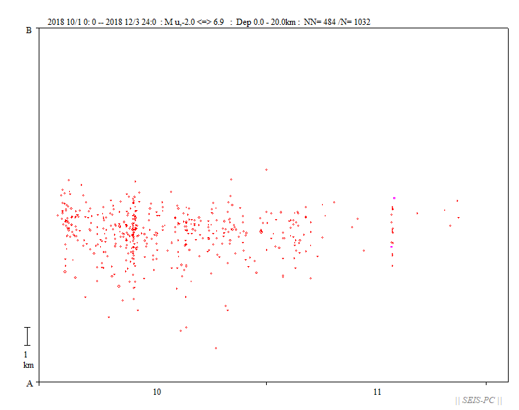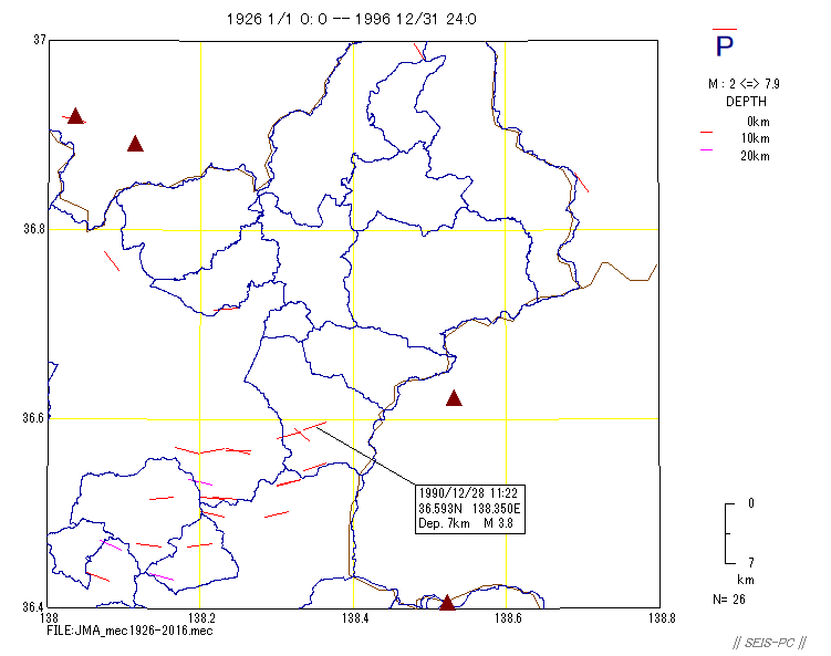 草津白根山北西側の地震(2018/10-) ![]() 図1:気象庁一元化震源の2018年10月1日から12月3日(日本標準時)までの震源データです。 Mすべて、深さ0kmから20kmまで。茶色線は県境で、濃青色線は市町村境界、こげ茶▲マークは、火山の位置。 今回の活動は、草津白根山のすぐ北西側(高山村)で起きているようです。 高山村の南西隣は、須坂市。 ![]() 図2:図1の枠内の震源の時空間変化図です。上側が、南東で白根山側。 ![]() 図3:図1の枠内の震源のマグニチュードの時間分布図です。 これまでで最大の地震は、M2.0のようです。 ![]() 図4:図1の枠内の震源の日別震源数の変化図です。 徐々に収まってきているようです。 ![]() 図5:図1の枠内の震源の断面図です。右側が南東です。 ほとんど深さ5kmより浅いところで起きているようです。 図中、右上の▲印は、草津白根山の山頂の位置です。 ![]() 図6:1997年から2018年11月28日までの気象庁が決定したP波初動による メカニズム解のP軸を地表面に投影した方位分布。 ![]() 図7:1997年から2018年11月28日までの気象庁が決定したP波初動による メカニズム解のT軸を地表面に投影した方位分布。 ![]() 図8:1926年から1996年までの気象庁が決定したP波初動による メカニズム解のP軸を地表面に投影した方位分布。 ![]() 図9:1926年から1996年までの気象庁が決定したP波初動による メカニズム解のT軸を地表面に投影した方位分布。