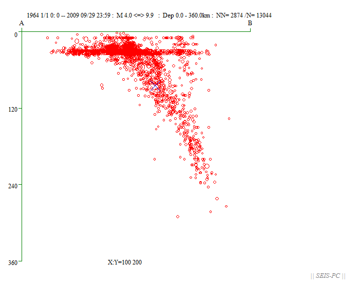 上の地図の中の長方形内の震源を示した断面図。青色×印が今回の震源。縦が水平距離に比べ2倍に拡大しています。深さ30km余りの所に直線上に震源が列んでいますが、これは事実ではありません。震源決定の過程で震源位置の決まりが良くないとき、深さを仮定して水平位置だけ決めます。こういう地震の震源は当然誤差が大きいのですが、決めないより情報が有る方が良いという考えで決めています。そのとき仮定する深さが10kmとか、33kmとか、35kmという値がよく使われます。誤差の大きな震源がこの深さに列んでいると考えながら図を見てください。