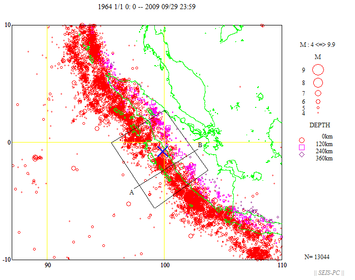 米国地質調査所(USGS)の震源カタログによる震央分布と今回の地震の震源位置(青色×印)。同所の速報では、M7.6です。ハーバード大グループのMwは7.5。この付近は南側のインド・オーストラリアプレートが北東側へ潜り込んでいて、今回の地震の震源は、沈み込んだ海洋プレートの中です(深さ81km)。日本付近で類似した地震としては、1993年01/15の釧路沖地震M7.8(深さ100km)とか、2008年7/24岩手県沿岸北部の地震M6.8、Mw6.8(深さ108km、死者1名)などです。地図中の長方形の中の震源による断面図を下に示しました。
