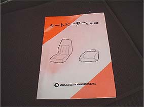 | これが、今回買ったシートヒーターです。ずいぶんと古そうなマニュアルが付いていましたが、新品です。おそらく、デットストックものじゃないかな。メーカーがカルソニックとありますが、レースとかに出てくるカルソニックなのでしょうか?謎です。 このシートヒーター。構造は単純で、シートに付属のゴムで固定して、シガーソケットにプラグを差し込むだけでOK。効果のほどは半信半疑でしたが、これが思いのほか暖かい。寒い早朝の出勤時、全ての窓が凍り付いているような状況でも、エンジンをかけてウインドウの霜落としをしている数分の間にシートはポカポカになります。今まで氷のようなビニールシートに腰を下ろしていたのがうそのよう。これは良いですよ。冬のドライブが楽しくなりました。 ちなみに、私の車は12Vダイナモですが、今のところバッテリーが上がってしまうことはありません。しかし、ヘッドライトを付けながら使用するとうっすらチャージランプが点灯します。大丈夫かいな??? |
