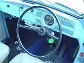 | さて、名実共に私の車になった水色ビートルですが、細かく見てみると前オーナーによる改造があります。あまりオリジナルにこだわるつもりもありませんが、デラックスタイプに交換されていたハンドルはオリジナルのか細いものに交換です。シフトもエンピタイプのものが取り付けられていましたが、純正よりもシフト部が手前で使いやすいため、これはこのままにしておきます。 また、改造ではありませんがおそらく当時ものの吊り下げ式AMラジオが付いていましたが、AMだけではなんですので交換したいですね。オーディオは今後の課題だな。 |