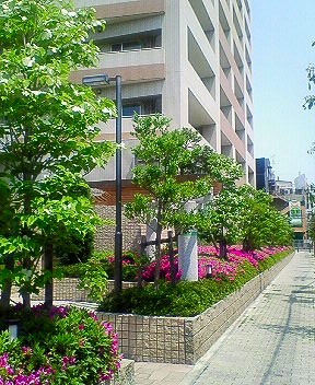 ![]() ↑初夏日和。暖かい日の光を浴びる植木と花壇。 |