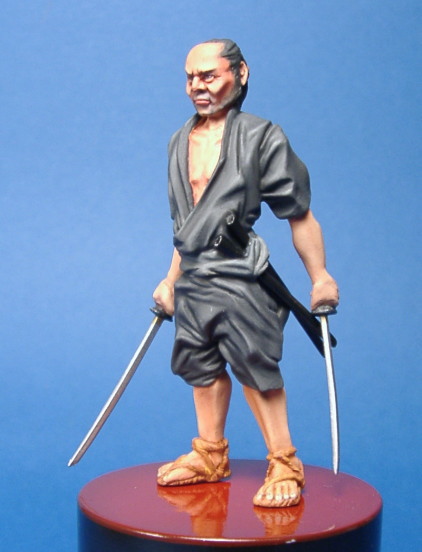 | かなりブサイクな方だった説が有力でして 自分なりに、いろいろ想像しながらエポパテをひねりました。 胴長短足だけどリーチ(腕)は長かったんじゃねぇーか・・とか 瞬発系が強かっただろうから、ふくらはぎはそれなりに・・とか あんまり二刀流では戦わなかったらしいけどイメージ優先 刀がぶっといですけど「抜き」の関係で限界っす。 金属板かなんかで削り出すといい感じになるかと思うのですが・・・ |