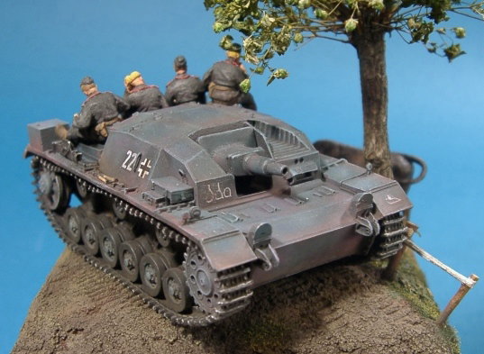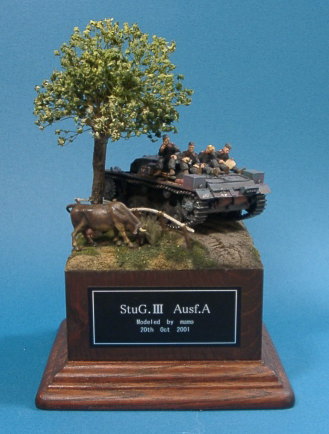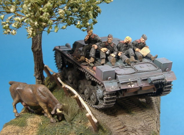 フィギアはSHQのメタル製のモノ モールド等、ダルさが気になりますが 塗ってしまえば、それほど気になりません。 リラックスしたポーズなど使える野郎共が 多いので重宝します。 モーモーさんはプライザー 木や柵はいつもの朽ち木を使っています。 |