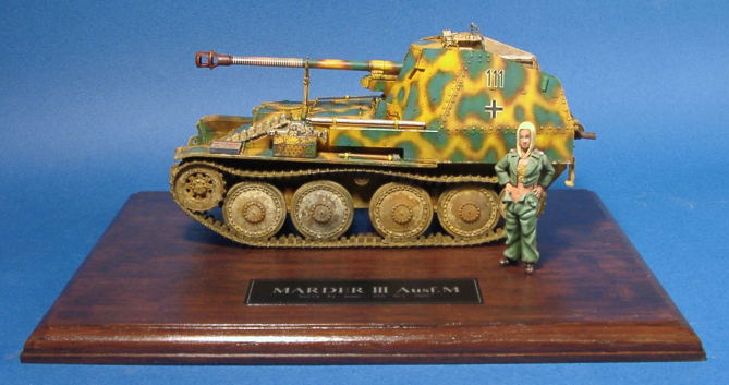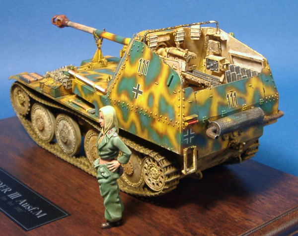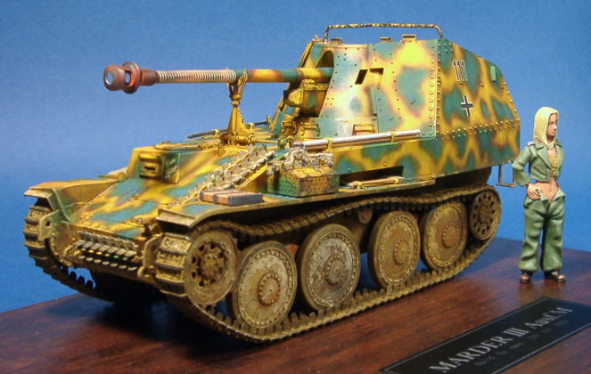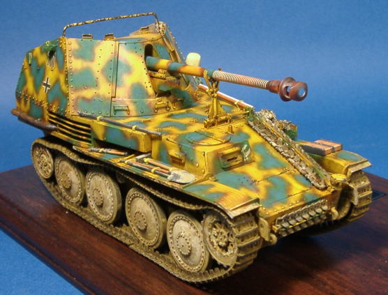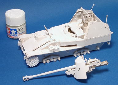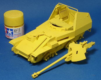 タミヤのMARDER V Ausf.Mです。 38(t)系列自走砲の最終型ってことで バランスが取れててなかなかの二枚目。 画像は基本塗装の段階 Fホワイト下地でFイエロー 黄色の鮮やかさが増します。 |