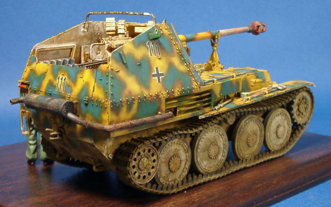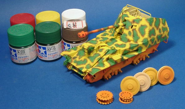 箱絵横にある印象的な豹柄三色迷彩でいきます。 グリーンはパークグリーンを主体に Fホワイト、Fイエロー、ダークグリーン等を混色。 ブラウンはNATOブラウンっす。 車体下部は赤系の色をオーバースプレー 転輪も色調を変えておきました。 この段階では非常におもちゃっぽいのですが ウォッシッング→フィルタリングでしっとりと落ち着かせます。 |