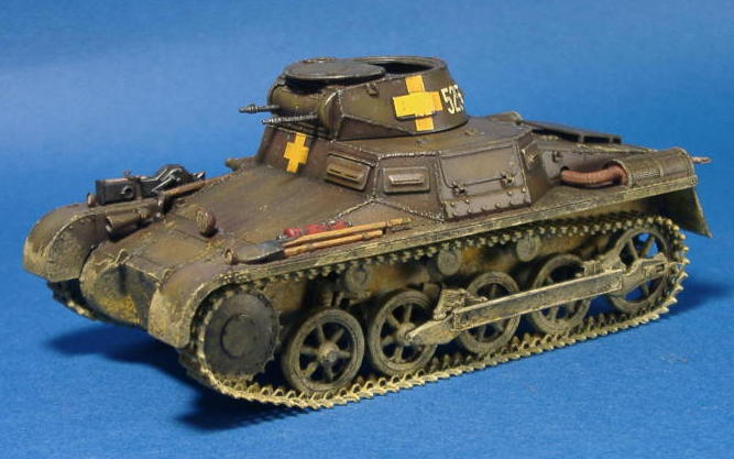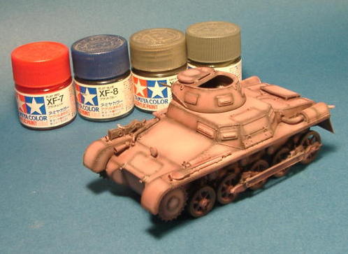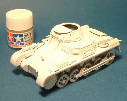 トライスターモデルの一号戦車A型 トライスター初の車両キットってわけで 組説にちょっと「?」なところもありますが パーツの合いなども良くて非常に組み立てやすいキットです。 今回はパンツァーグレイ単色って事で 以前にBT−7でやった塗装法を応用してみました。 まんずFホワイトをブワーっと吹いてキャンバスを作りやす。 |