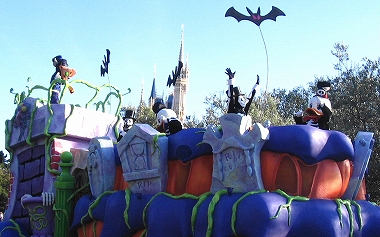 | 門柱にあたる先頭フロートには、やっぱりガーゴイル | ホーンテッドマンション風のカチューシャがカワイイ |