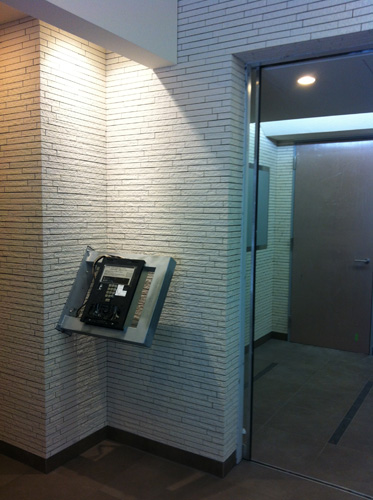 エントランスの集合玄関機。壁から突き出たデザインとし軽快さを表現。