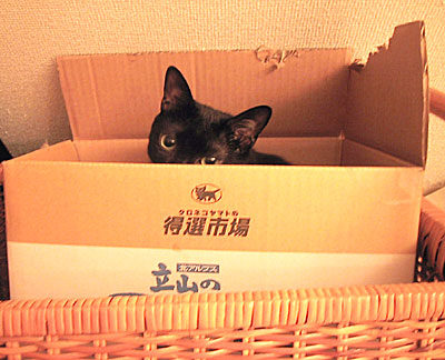 新しい猫ベッドが来ました。夜は僕は主人のふとんにもぐるけど、サヤンが臆病で同じようにできないので ひとりぼっちのサヤン用に買った物なんだけど、僕も気に入った。だってすごいフカフカで気持ちいいんだもん。 |