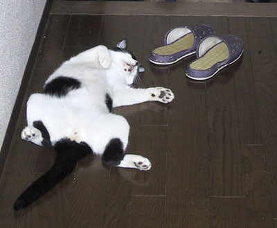 育ち盛りのサヤンの食欲はほんとにすごい。自分のを食べ終えると僕のお皿に顔つっこんでくるよ。しかもどうも自分より僕のお皿の方が美味しい物が入ってるんじゃないかって疑ってるらしいんだよね。それは誤解なんだけど、サヤンのは薬が少し入っているのできちんとわけなきゃいけないんだ。僕は他のこと(とっくみあいとか場所取りとか主人に甘えるとか)ではサヤンを押さえて優勢だけど、ごはんはけっこう譲っちゃうんだよね。自分より幼い子には優先的に食べさせてやるのが余裕のある大人の猫のやりかたなのさ。 |