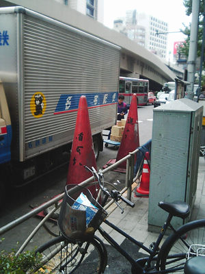 会社の近くで凄くでっかい三角ポールを見ました。こんだけデカイと迫力あります。 それに負けじと、路駐するトラックも凄い…。
