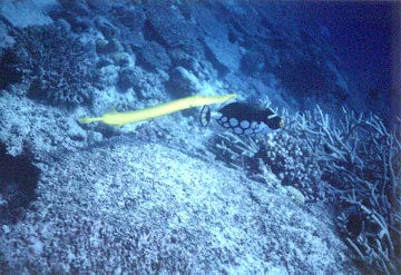 ヘラヤガラとモンガラカワハギの異色カップル。