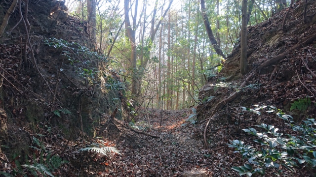 曲がると堀底道になります。堀底道の両側は土塁です。