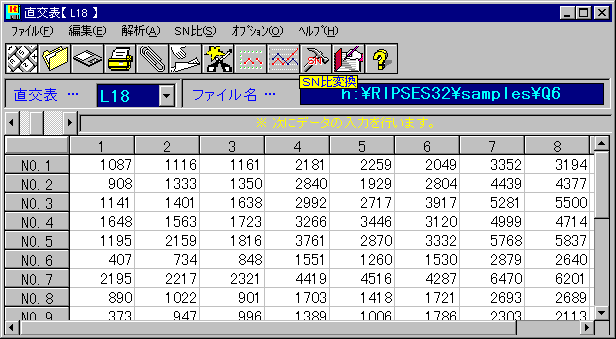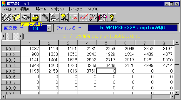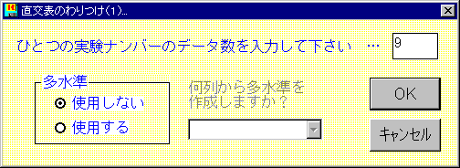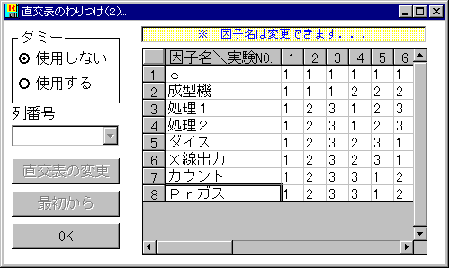 - 各実験ナンバーのデータ数の入力、直交表のわりつけ